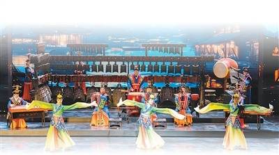 臺上,古編鐘、編磬、鼓、箎、笙、琴、瑟、排簫等多種傳統(tǒng)樂器,與現(xiàn)代樂器、燈光舞美結(jié)合,配合長袖翩翩的舞蹈,仿佛瞬間將觀眾帶入一個貫通古今的聲場。